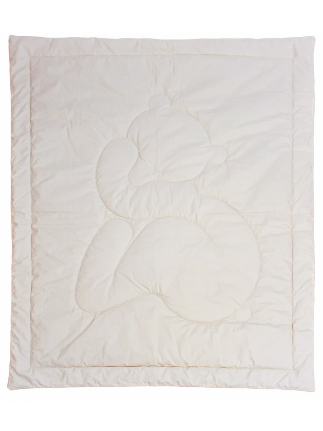 Сонный маленький медвежонок на стежке одеяла непременно понравится малышу, а хлопковая ткань чехла и наполнитель из натуральной шерсти оценят заботливые родители.