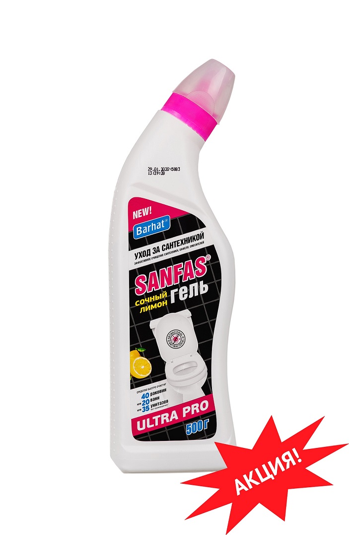 Средство Ультра Санфас гель для чистки унитазов, раковин, ванн идеально растворяет водный и мочевой камень и препятствует его образованию в унитазах, великолепно чистит, дезодорирует, удаляет ржавчину и другие трудные загрязнения в туалете и в ванной комнате на длительное время.
