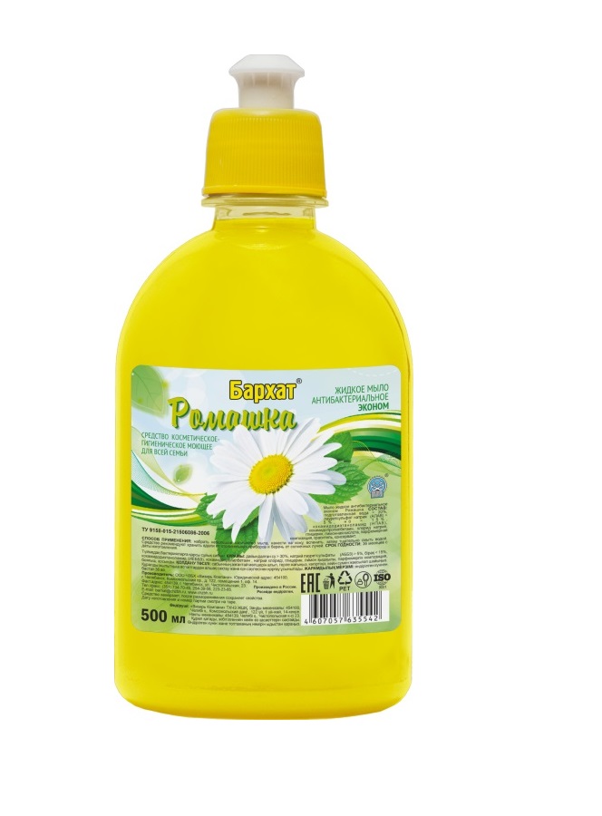 Мыло жидкое "БАРХАТ " Ромашка (антибактериальное) прекрасно подходит для мытья рук, посуды и любых поверхностей на кухне.