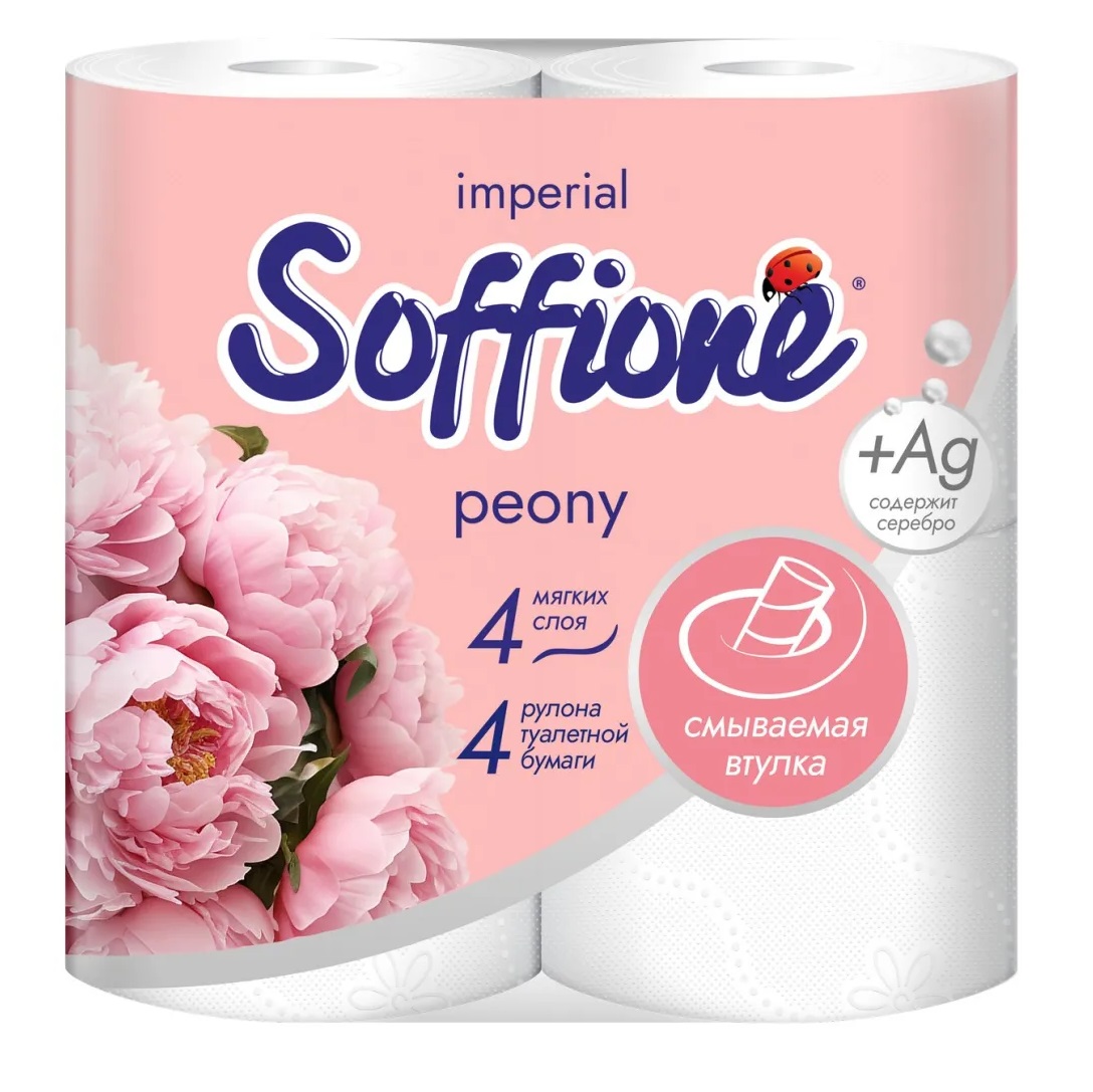 Бумага туалетная SOFFIONE Peony белая, с тиснением, перфорацией и ароматом пиона, со смываемой втулкой.